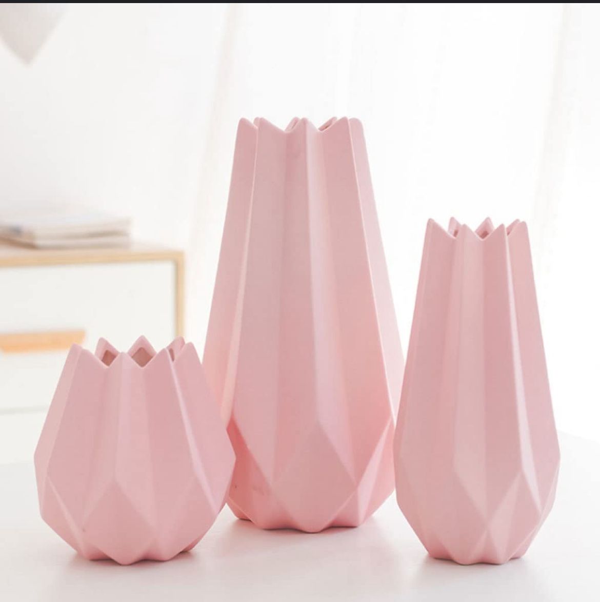 ✨ Create a peaceful, pretty corner in your home. Order your 3-piece Pink Geometric Vase Set today and embrace Nordic charm!