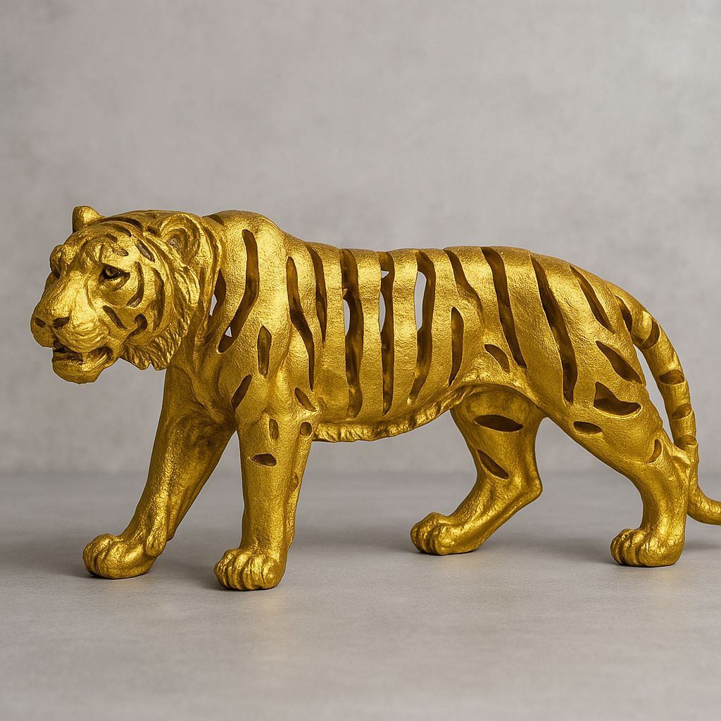 Unleash the king of your decor collection with this Golden Tiger-Lion Figurine, a majestic blend of the fierce tiger's presence and the regal lion's strength. With its radiant gold finish and bold cut-out design, this artistic piece is the perfect symbol of power, leadership, and protection—ideal for those who decorate with purpose and passion.